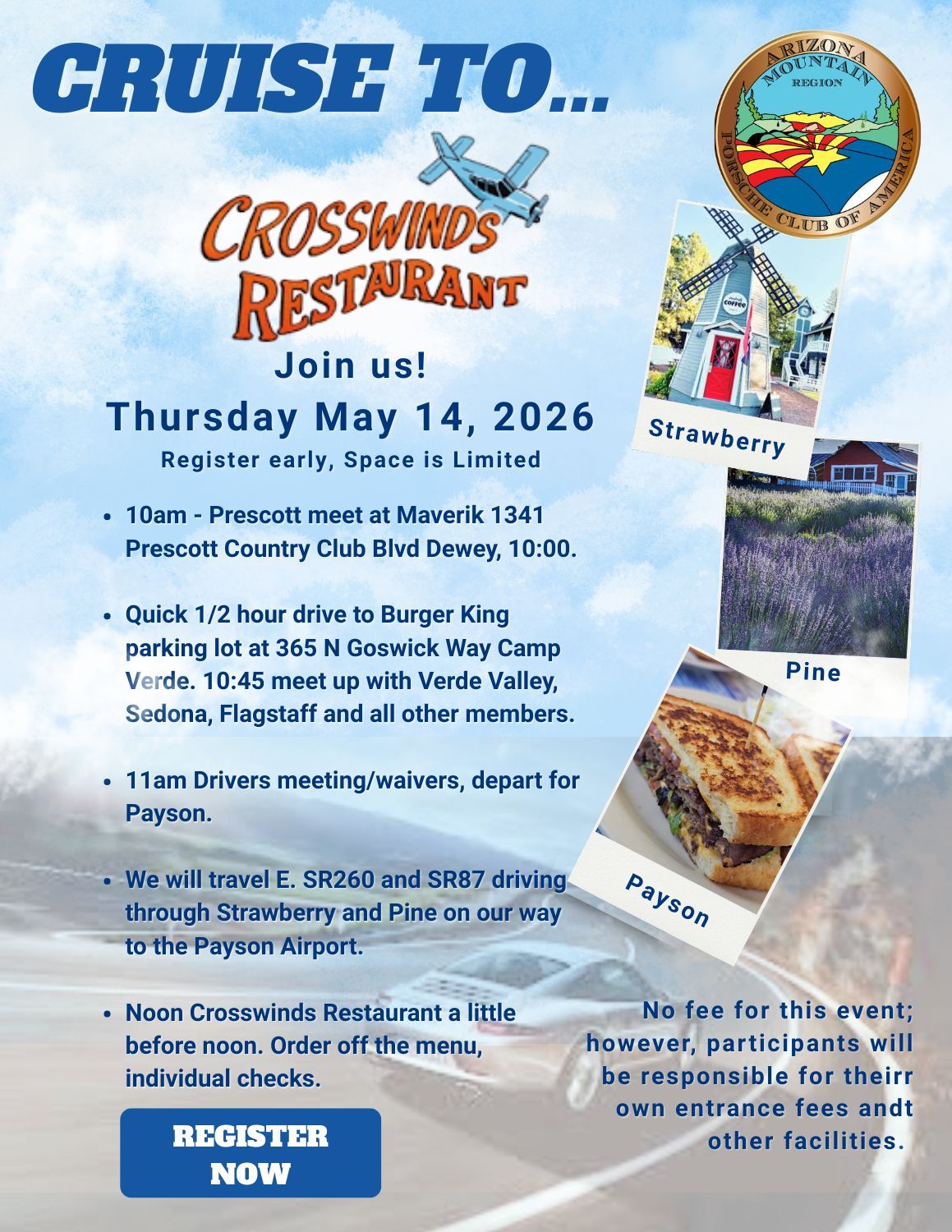 Verde Valley, Sedona, Flagstaff and all other members please meet in the Burger King parking lot at 365 N Goswick Way Camp Verde, AZ at 10:45. We will have a Drivers Meeting and sign waivers with a planned departure at 11:00 which should put us at the Crosswinds Restaurant a little before noon. We will travel E. SR260 and SR87 driving through Strawberry and Pine on our way to the Payson Airport. Our reservations are for noon in the meeting room. We will be ordering off the regular menu with individual checks.