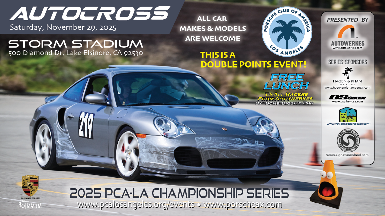 PCA Los Angeles invites you to come out and join us for the 13th and final event in our monthly autocross series. Our series has been organized by volunteers with a long history of running POC and PCA sanctioned autocross events. Autocross is a fun way to learn the basic handling dynamics of your car in a controlled environment.